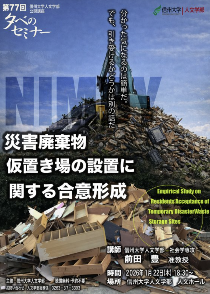 人文学部公開講座 第77回夕べのセミナー「災害廃棄物仮置き場の設置に関する合意形成」開催のお知らせ