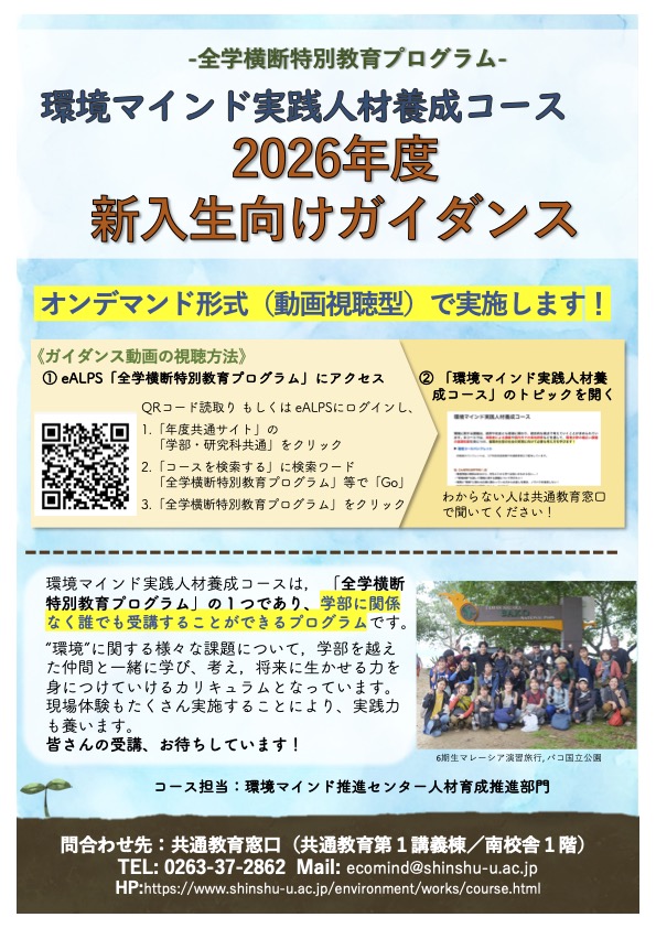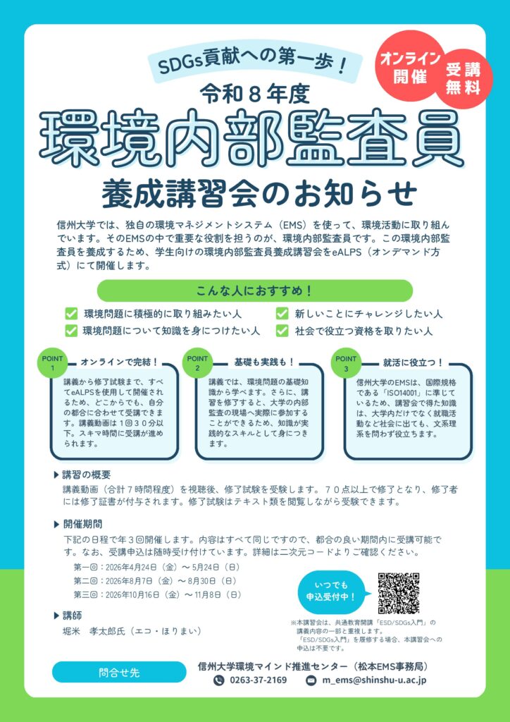信州大学環境マインド推進センターでは、信州大学の学生に向けて、令和8年度 環境内部監査員養成講習会を開催します。