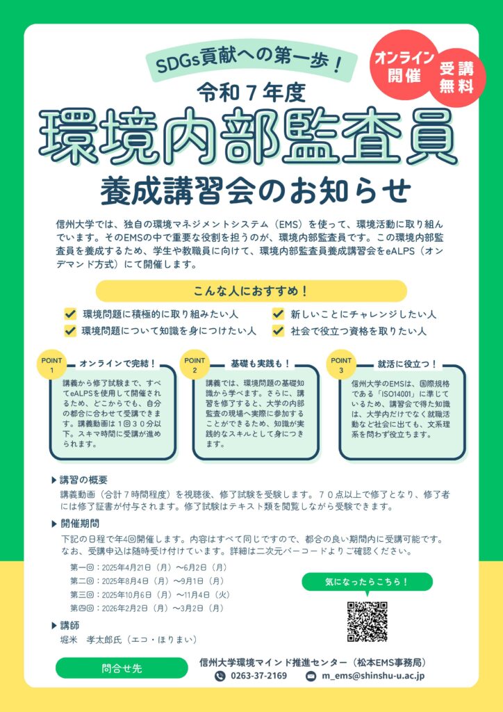 【信大生向け】2025年度 第三回 環境内部監査員養成講習会 開催のお知らせ