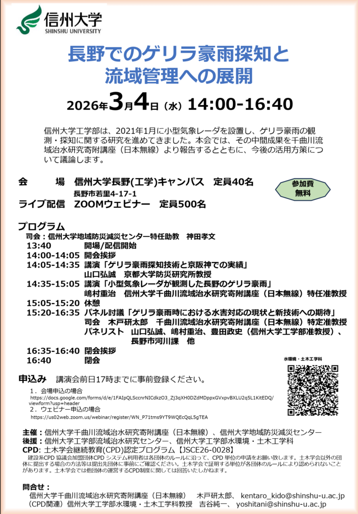 一般公開 令和7年度寄附講座講演会『長野でのゲリラ豪雨探知と流域管理への展開』