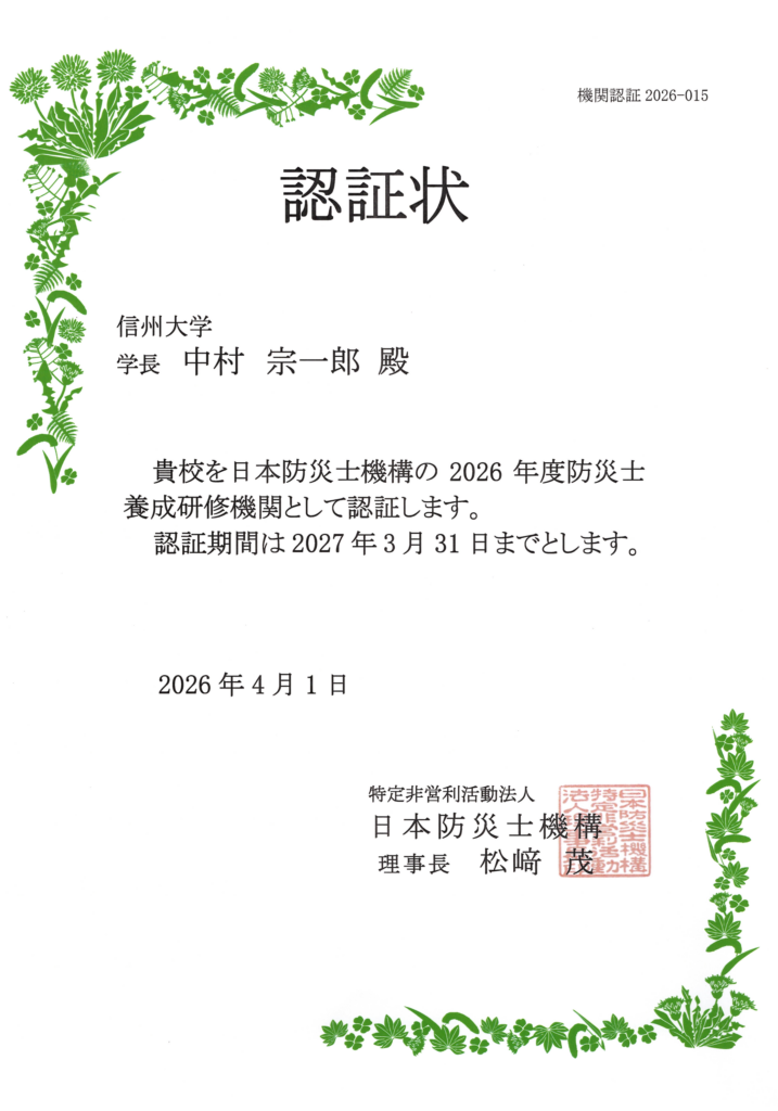 信州大学では2022年から 日本防災士機構 防災士養成研修機関の認証を受けています。