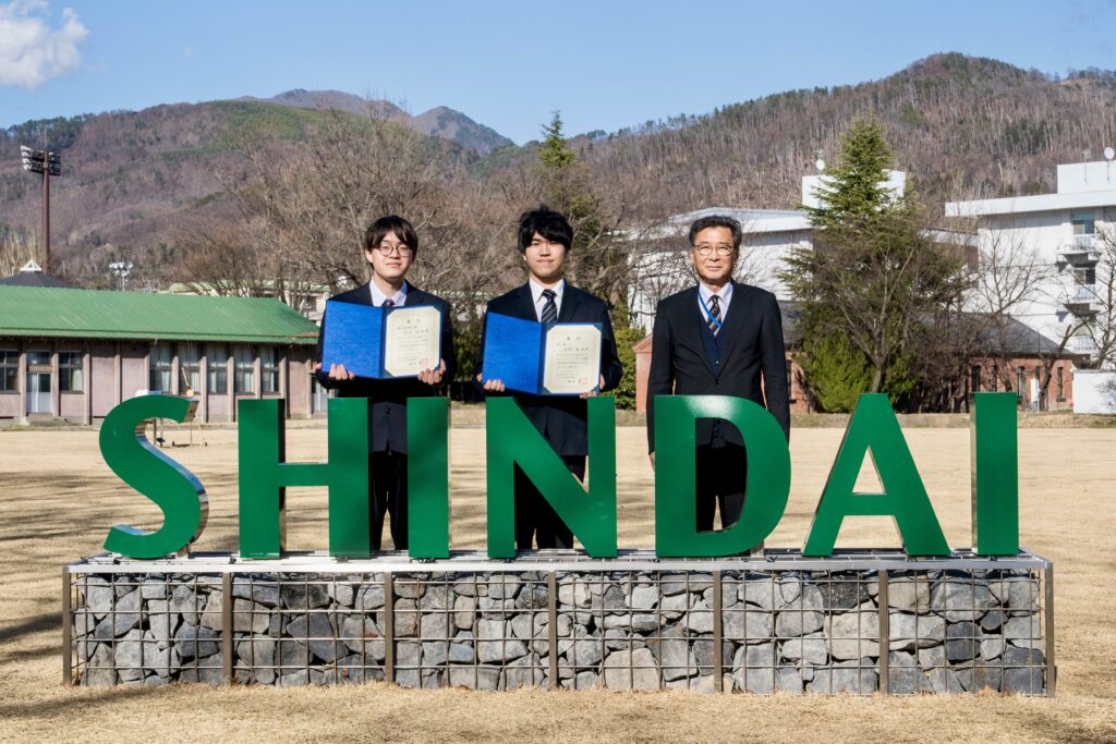 3月27日(金)には、参加可能な受賞者を集めて、授賞式を行いました。サステナブル社会協創機構の藤澤機構長より、賞状と副賞が手渡され、記念撮影を行いました。(写真:右から藤澤機構長、森野さん、伊奈さん)